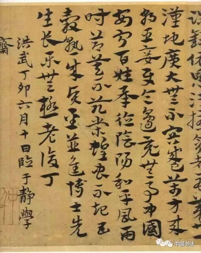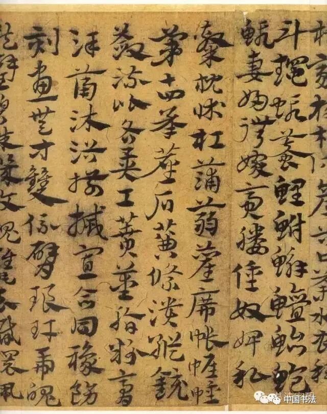 宋克《急就章》。宋克,字仲温,元末明初吴郡长洲人。因家居南宫里,自号南宫生。少任侠,杜门写字,日费千纸。尤工章草。所书《急就章》传世多种。今印行者,一为洪武庚戌本,一为洪武丁卯本,而以庚戌本最为完整亦最具影响。王颂馀在《明宋克章草急就章卷》一文中,称宋克“行笔劲健而气韵恰合,章法严密,首尾气势相连,顾盼生姿,笔画中的波脚与瘦劲的点画形成对比,特别是字里行间的穿插争让,给人以流动的感觉”。不足之处是比较纤巧,略失浑朴。宋克的章草传帖,还有《唐张怀曜论笔十法》与《书孙过庭书谱》等。此两帖均将章草与正楷相间书写,并不纯粹。