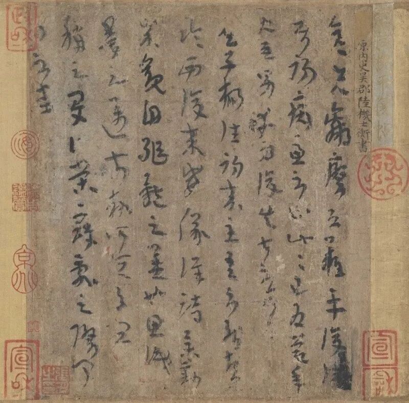 陆机《平复帖》。陆机,字士衡,西晋吴县华亭人。善文章,工草书。其《平复帖》九行,仅存八十四字,尚有数字不可识。为秃笔所书。明人詹景凤《东图玄览编》谓此帖“与索幼安(靖)《岀师颂》齐名”。古人每以“奇古”、“奇伟”、“奇幻”称之。《宣和书谱》称此帖为“章草”,米芾《书史》以降,时或不以为然。因此,笔者在拙著《简明书法教程》中将其归入“中介书体”。后将帖中之字,逐一与简牍章草比较,发现此帖颇似简牍章草,尽管“原迹上的每一个字无蚕头燕尾,亦无银鈎盥尾之状”,仍应以章草视之为宜。笔者以为,从《平复帖》似乎可以看出史游《急就章》的一些影子。