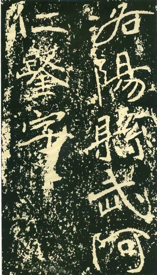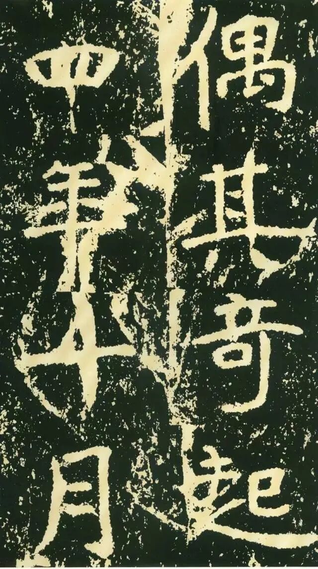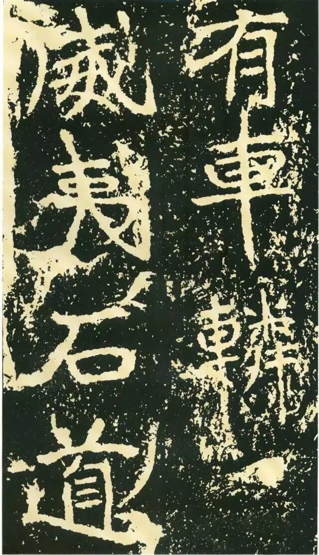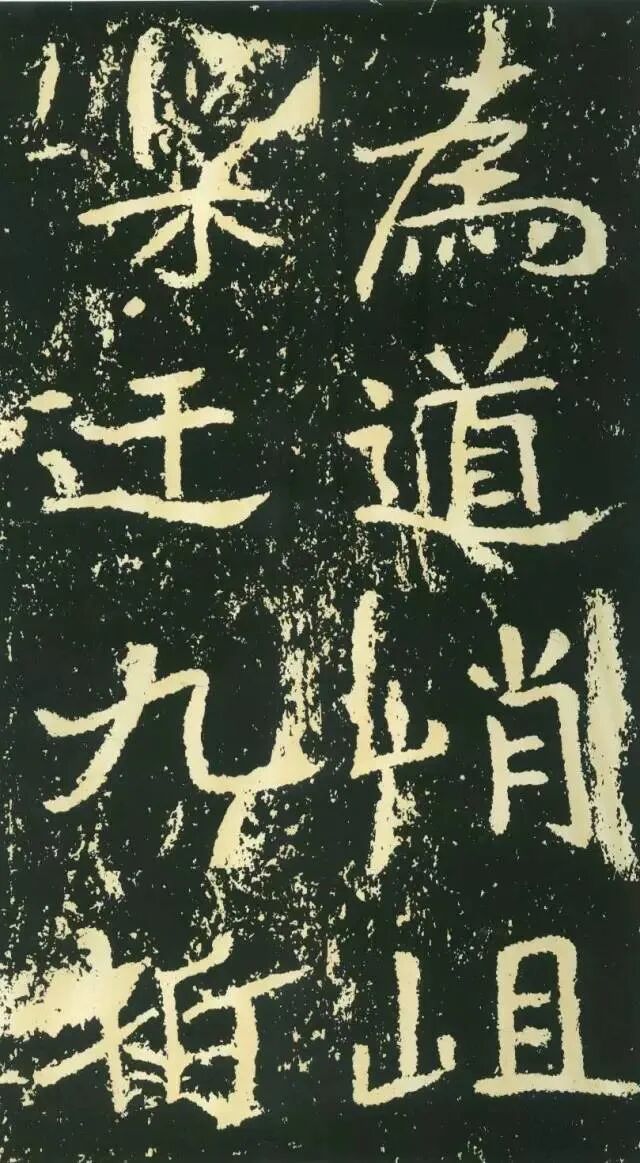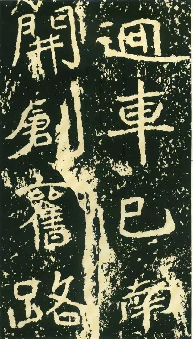二、因字生形,意形相托。《石门铭》的很多结字一时有一时之态,不拘常调。如“方”字点画重入,横画一波三折,撇画很长,气势非凡。“成”字笔画有意处理得“松散”,使整个字变得很疏朗。“州”字形体本身很特殊,三部分大致相同,但此字自左至右逐渐向下倾斜,动感顿生。“仁”字单人旁稍向左倾,“二”部向右倾斜,左右两部分形成互动。“崄”字造型很别致,“山”部安放在左上部,力压千钧,却又稳稳当当。“途”字“余”部欹斜取势,“辶”恰如一叶小舟,上面一船夫正奋力划桨,乘风破浪,驶向远方。