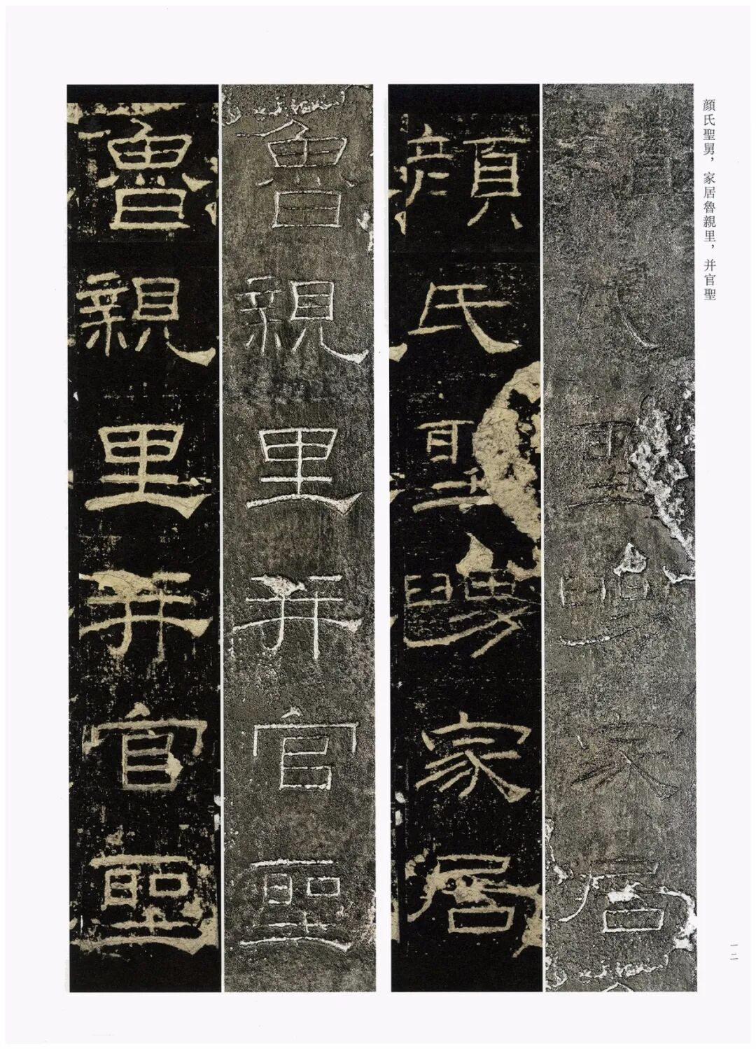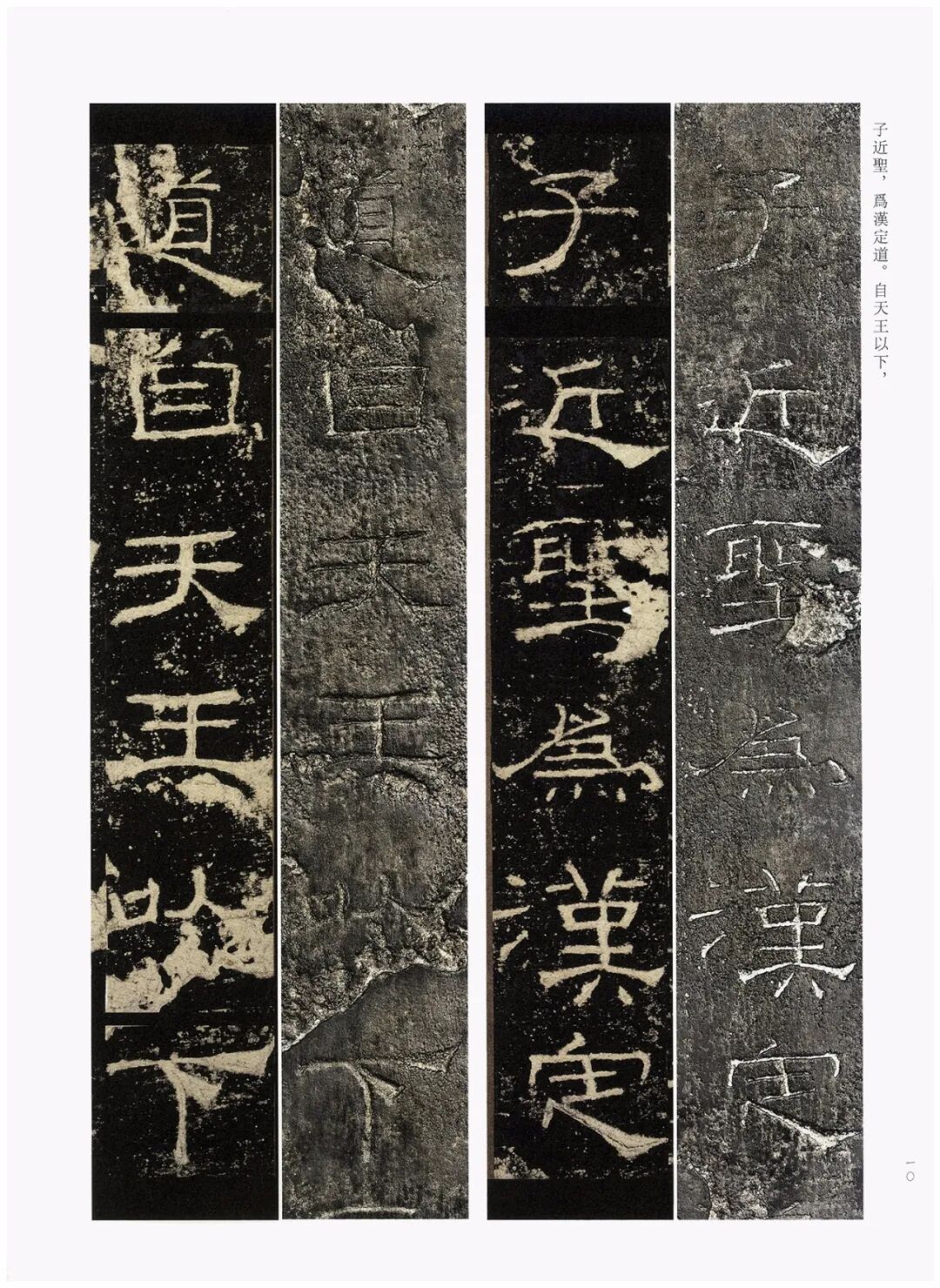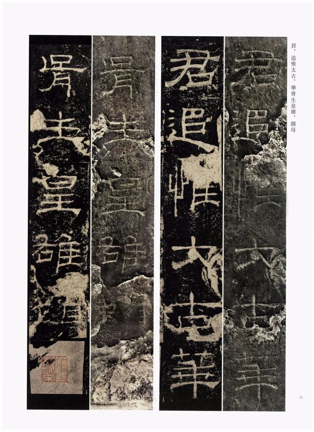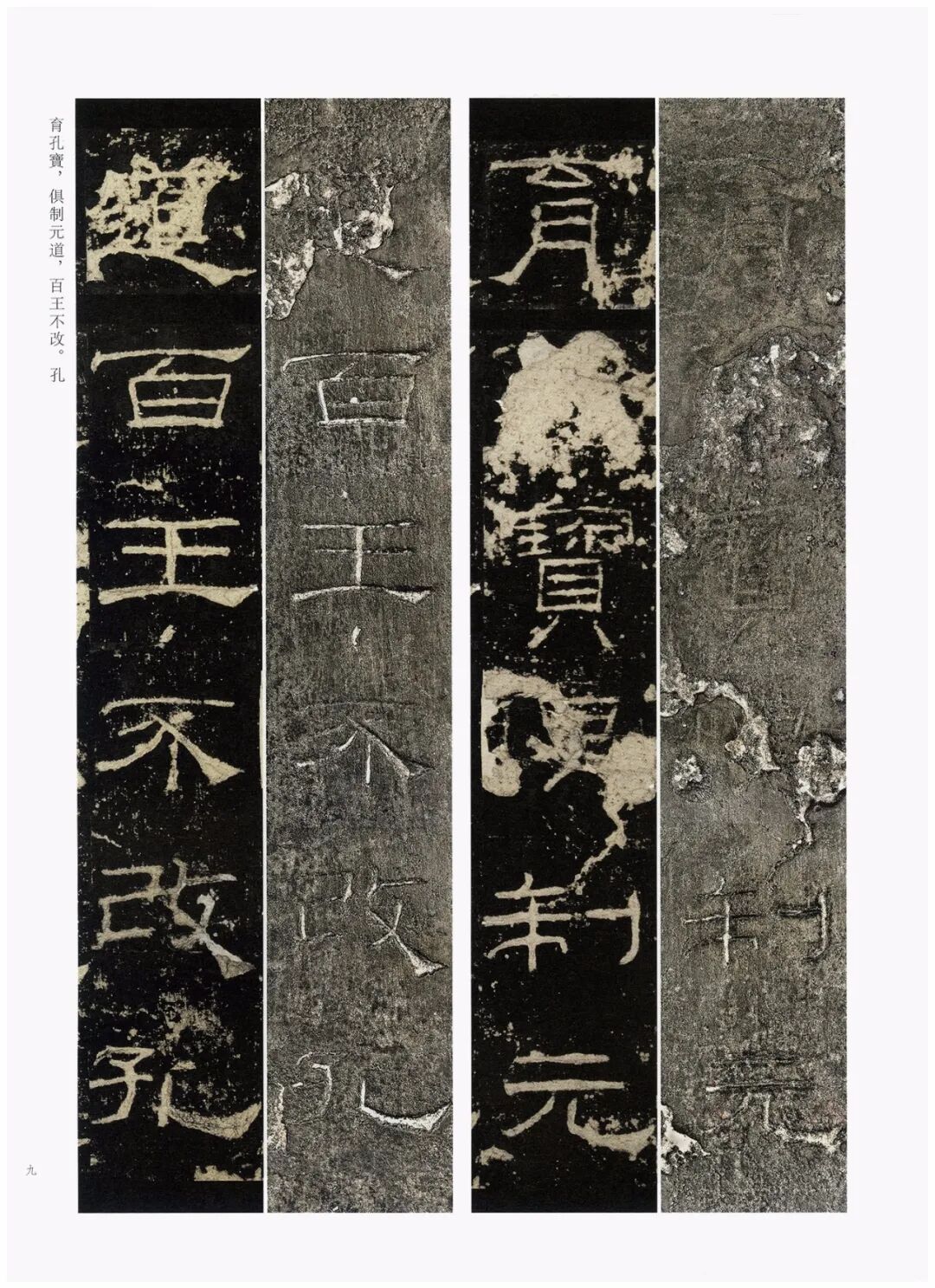 第三,加大开本。《礼器碑刻拓对勘》采用8开大小的开本(成品尺寸350mm×260mm),较之《张猛龙碑刻拓对勘》(16开,成品尺寸285mm×210mm)大了很多。书中的原拓与原石照片也略加放大,为原大尺寸的120%左右。能够更好地满足读者对于高清印本和刻拓细节的追求。